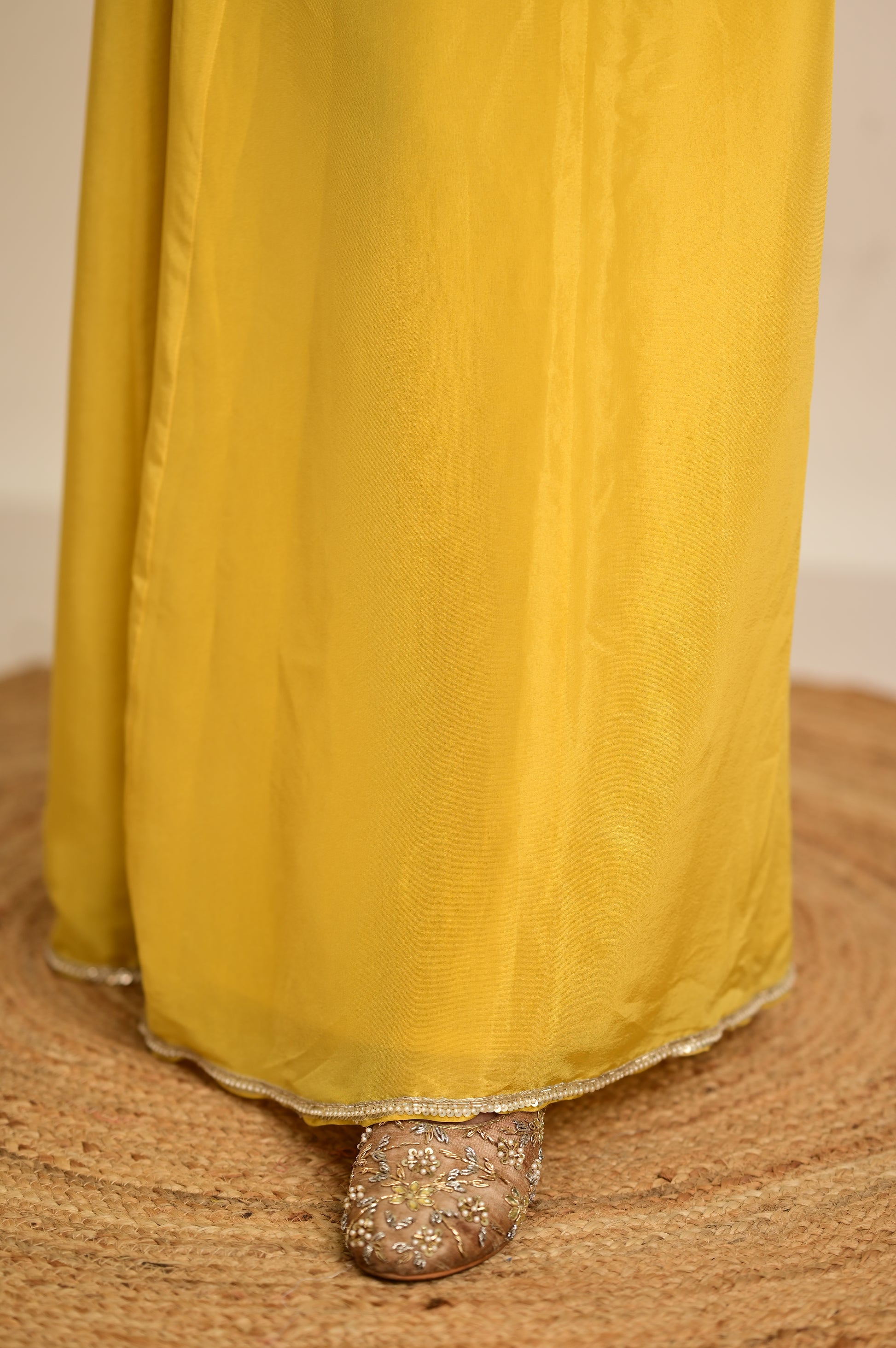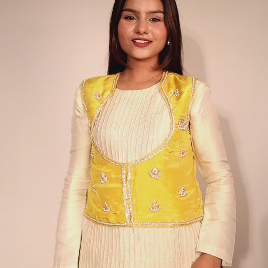 A perfect harmony of yellow and off-white tones, this graceful three-piece set combines classic craftsmanship with a modern silhouette. The off-white satin tissue short kurta features delicate dori work and full sleeves, paired with flowy yellow tissue palazzos for an effortless fall. The look is elevated with a yellow tissue koti jacket, embellished with jadau hand embroidery and intricate bead detailing, creating a festive yet refined statement ensemble.