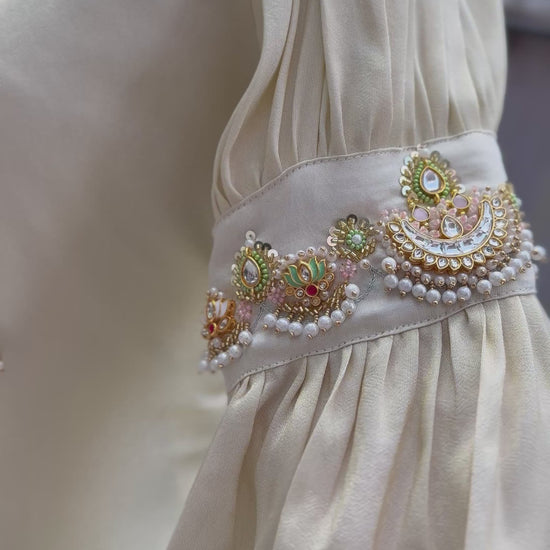 An elegant off-white dress designed with modern lines and subtle handcrafted detailing. Featuring jadau hand embroidery on the front and statement sleeves, this dress brings effortless sophistication to festive and semi-formal occasions. The double-side slits add graceful movement and comfort, making it a timeless Indo-Western piece.