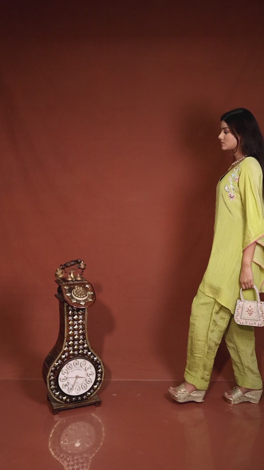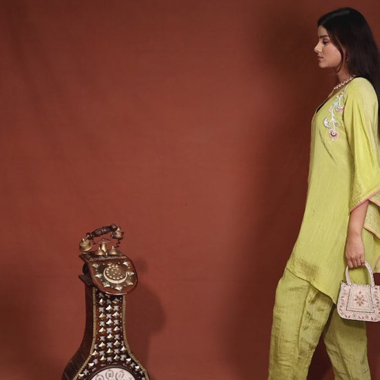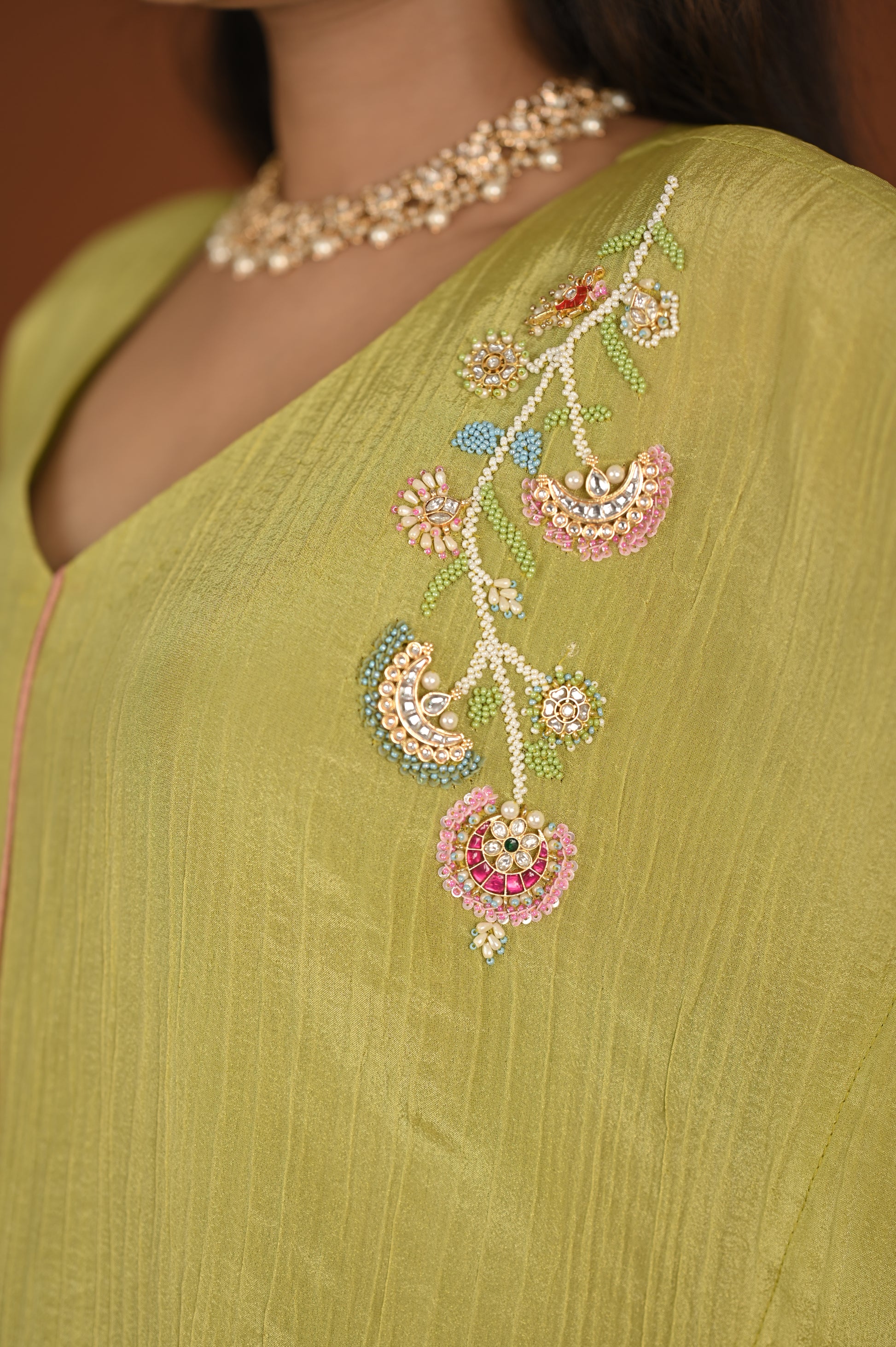 A refreshing green kaftan set crafted in lightweight tissue fabric, blending comfort with understated elegance. The kaftan features handcrafted jadau embroidery and contrasting pink piping that adds a delicate festive charm. Paired with matching elasticated pants featuring side pockets for ease, this set is perfect for both casual celebrations and elegant gatherings.
